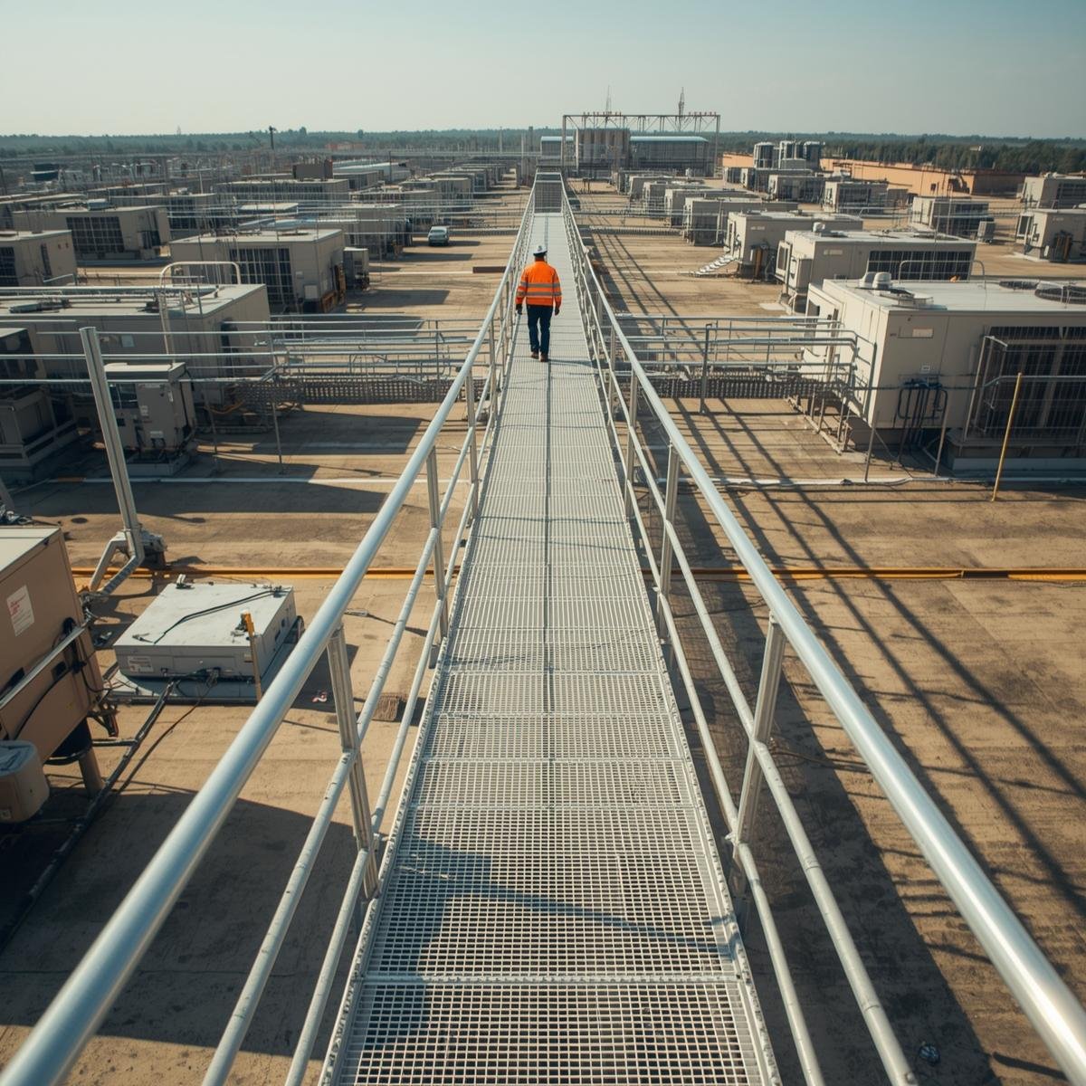 Fabrika çatılarında, enerji santrallerinde ve kaygan zeminli endüstriyel alanlarda güvenli geçiş hatları oluşturuyoruz. Bakım personelinin düzenli erişim ihtiyaçlarını güvenli şekilde karşılayarak, çatı üzeri ekipman bakımı ve denetim çalışmalarının risksiz yürütülmesini sağlıyoruz.
